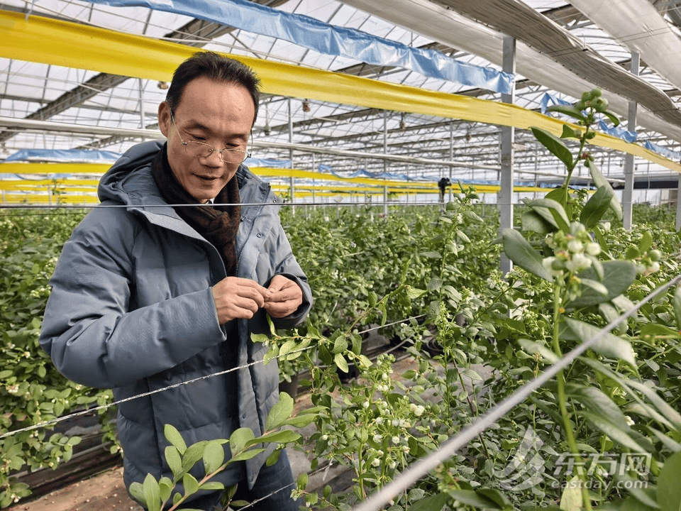 在白鹤镇,科技赋能农业的故事不止于草莓。记者驱车来到孰美果业蓝莓种植基地,智能大棚内的蓝紫色果实挂满枝头,细密的天然果粉见证着新鲜品质。“往年要等到5、6月才能吃到蓝莓,今年2月就能尝鲜了!”上海孰美果业有限公司总经理沈法拿起一颗饱满的果实向记者介绍,通过智能温控系统精准调控生长环境,结合品种优化,蓝莓成熟时间较传统模式提前近四个月,让上海市民在春节前夕就尝到本地培育的清甜滋味。这款名为“花香蓝莓”的品种,不仅上市早,更在口感上实现突破——纯甜带脆的果肉裹挟着淡淡花香,成为市场新宠。